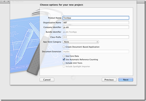 Framework側のプロジェクトは開いたまま、新規にCocoaアプリケーションプロジェクトを作成します。![]()