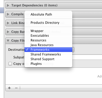 今回はFrameworkをCopyしたいので、Destinationを「Resources」から「Frameworks」に切り替えます。