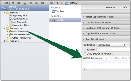 Framework側プロジェクトのProductsのUtils.frameworkをTesetAppプロジェクトへDrag & Dropして、プロジェクトの参照関係を設定します。